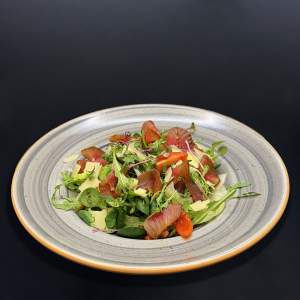 csirkemell, jégsaláta, paradicsom, lilahagyma, cézár-öntettel, zsemlekocka, trappista sajt